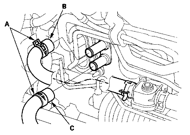 6. Slide the hose clamps (A) back, then disconnect the inlet heater hose (B) and the outlet heater hose (C) from the heater core. Engine coolant will run out when the hoses are disconnected; drain it into a clean drip pan. Be sure not to let coolant spill on the electrical parts or the painted surfaces. If any coolant spills, rinse it off immediately.