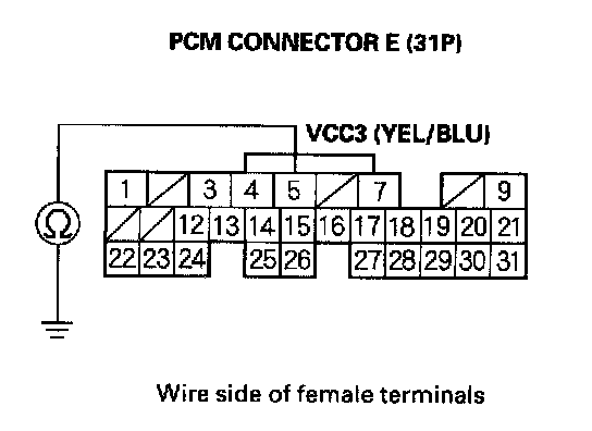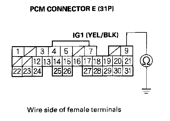 25. Check for continuity between PCM connector terminal E9 and body ground.