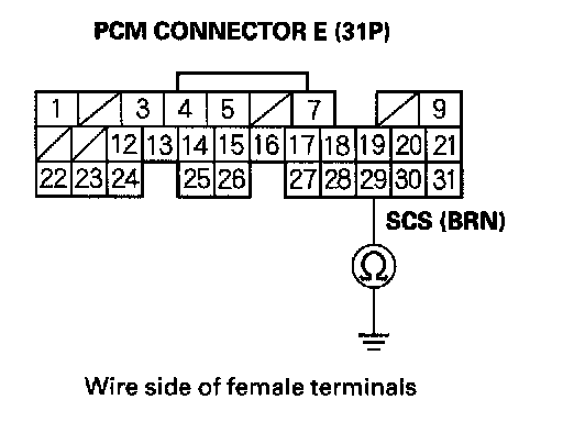 27. Check for continuity between PCM connector terminal E9 and body ground.