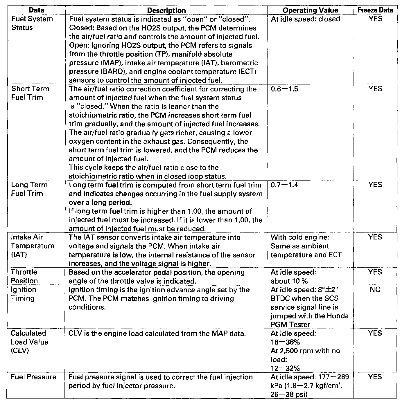 You can retrieve data from the PCM by connecting the OBD II scan tool or the Honda PGM Tester to the Data Link Connector (DLC). The items listed in the table conform to SAE recommended practice. The Honda PGM Tester also reads data beyond that recommended by SAE to help you find the causes of intermittent problems.