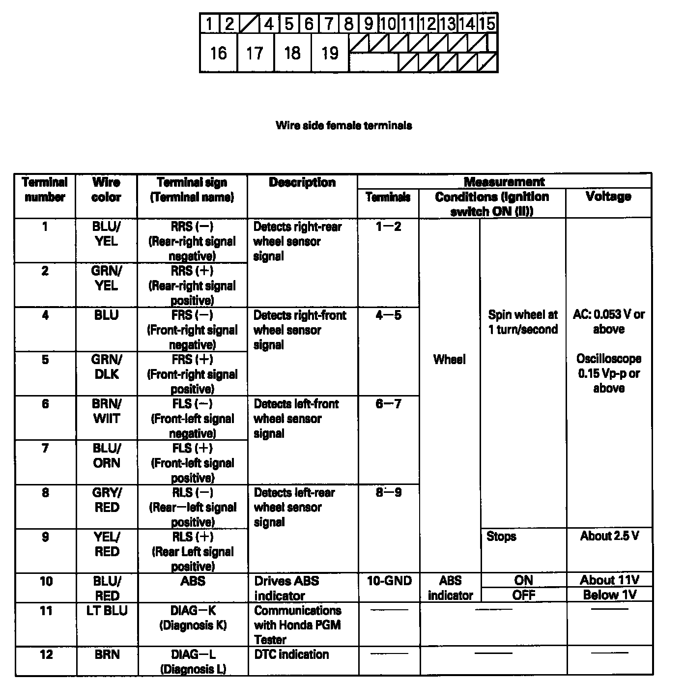 ABS Control Unit Inputs and Outputs for 31P Connector