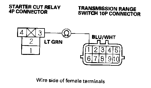 11. Check for continuity between starter cut relay 4P connector terminal No. 3 and transmission range switch 10P connector terminal No. 1.