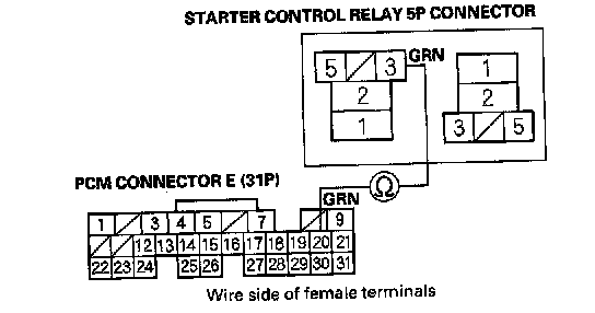 NO -Repair an open in the wire between starter control relay 5P connector terminal No. 3. and PCM connector terminal E20