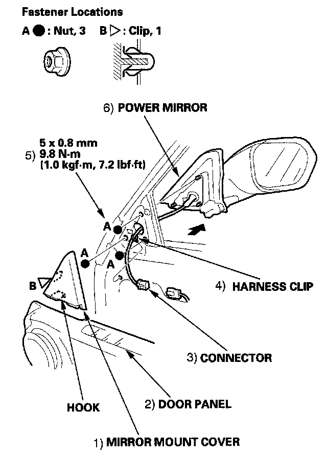 Power Mirror ReplacementNOTE: To avoid scratching the door, be sure to hold the mirror while removing or installing the nuts.
