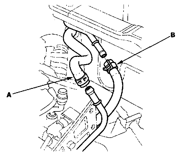 10. Remove the brake booster vacuum hose (A) and the evaporative emission (EVAP) control canister hose (B).