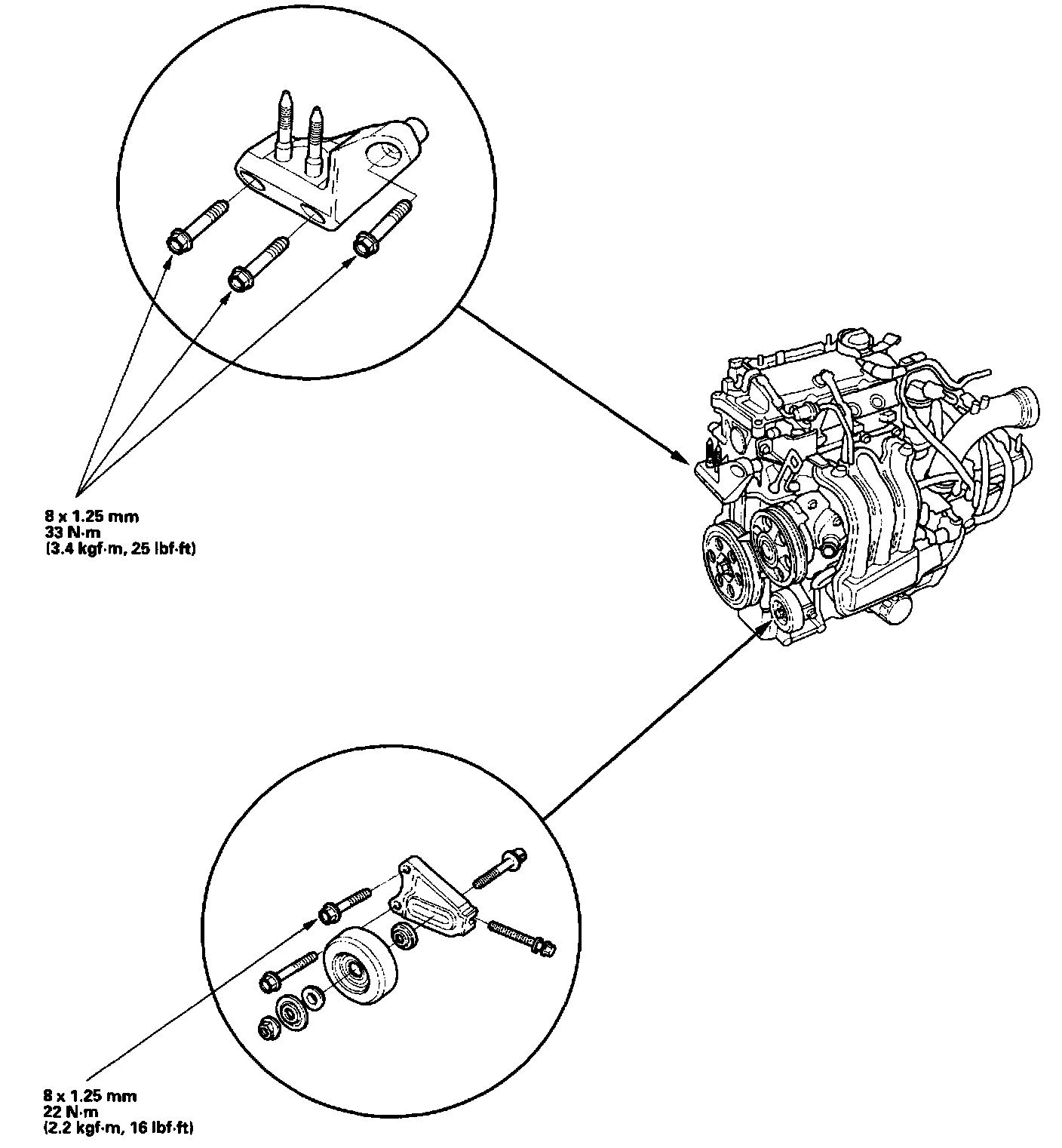 1. Install the engine mount and the idler pulley, and tighten their bolts to the specified torques.