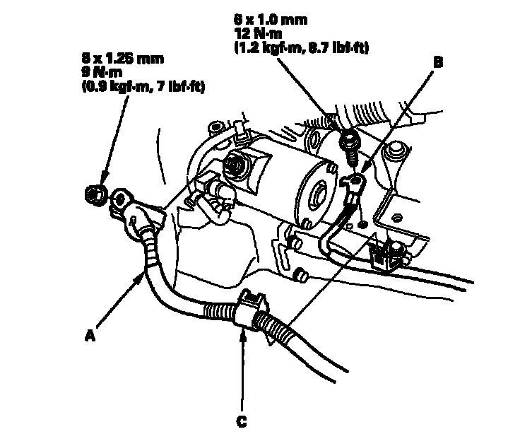 11. Remove the ground cable (A), starter cable (B), and harness clamp (C).