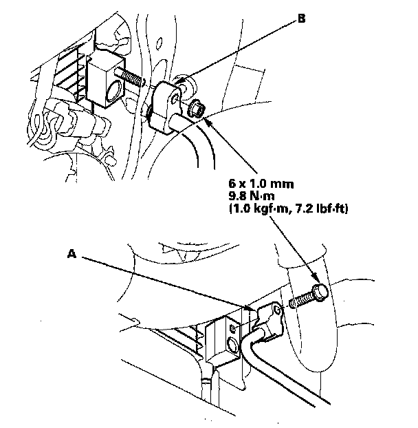 3. Remove the bolt and the nut, then disconnect the condenser line (A) and the discharge line (B) from the condenser. Plug or cap the lines immediately after disconnecting them to avoid moisture and dust contamination.