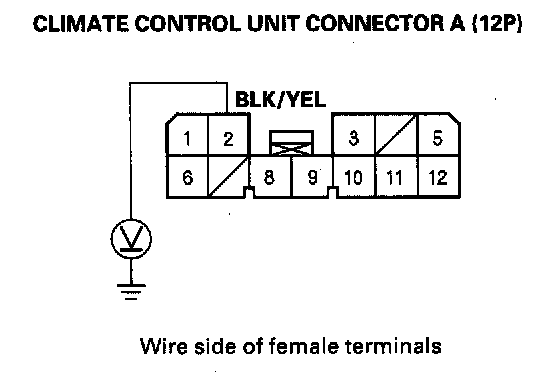 6. Measure the voltage between the No. 3 terminal of climate control unit connector A (12P) and body ground.