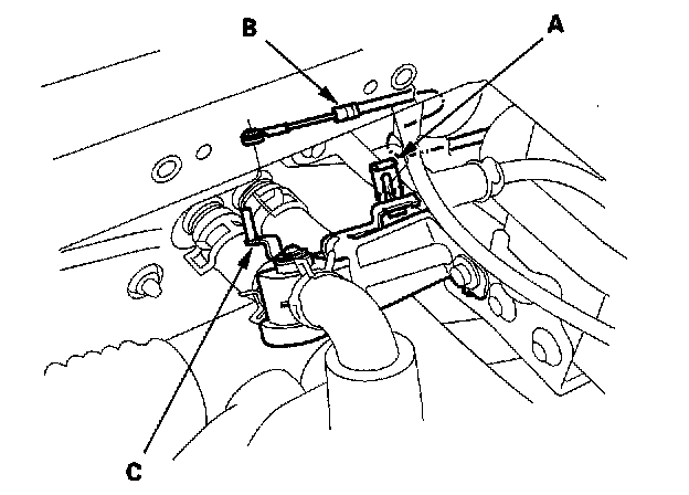 Heater Valve Cable Adjustment1. From under the hood, open the cable clamp (A), then disconnect the heater valve cable (B) from the heater valve arm (C).