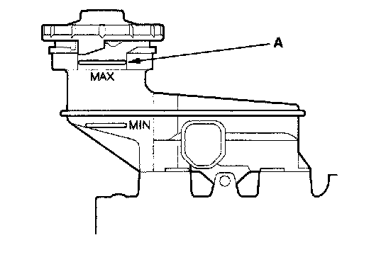 1. Make sure the brake fluid level in the reservoir is at the MAX (upper) level line (A).
