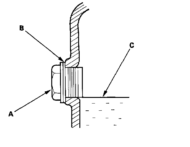 3. Remove the oil filler plug (A) and washer (B), check the condition of the fluid, and make sure the fluid is at the proper level (C).