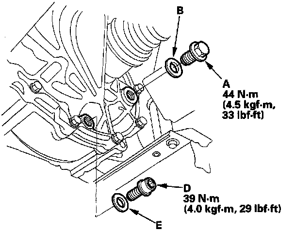 5. Reinstall the drain plug (D) with a new washer (E), and refill the transmission fluid to proper level.