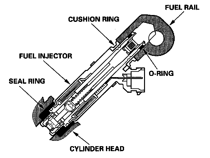 The fuel injectors are a solenoid-actuated constant-stroke, pintleless-type consisting of a solenoid, plunger needle valve, and housing. When current is applied to the solenoid coil, the valve lifts up and pressurized fuel is injected. Because the needle valve lift and the fuel pressure are constant, the injection quantity is determined by the length of time that the valve is open (that is the duration the current is supplied to the solenoid coil). The fuel injector is sealed by an O-ring and seal ring at the top and bottom. These seals also reduce operating noise.