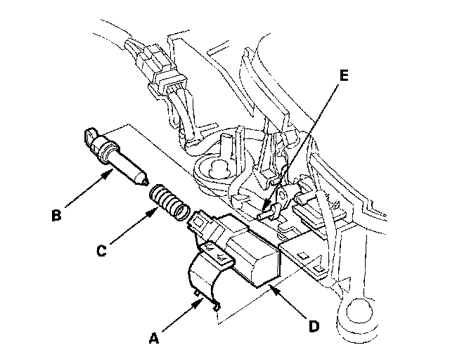 5. Install the shift lock solenoid plunger (B) and plunger spring (C) in the new shift lock solenoid (D).