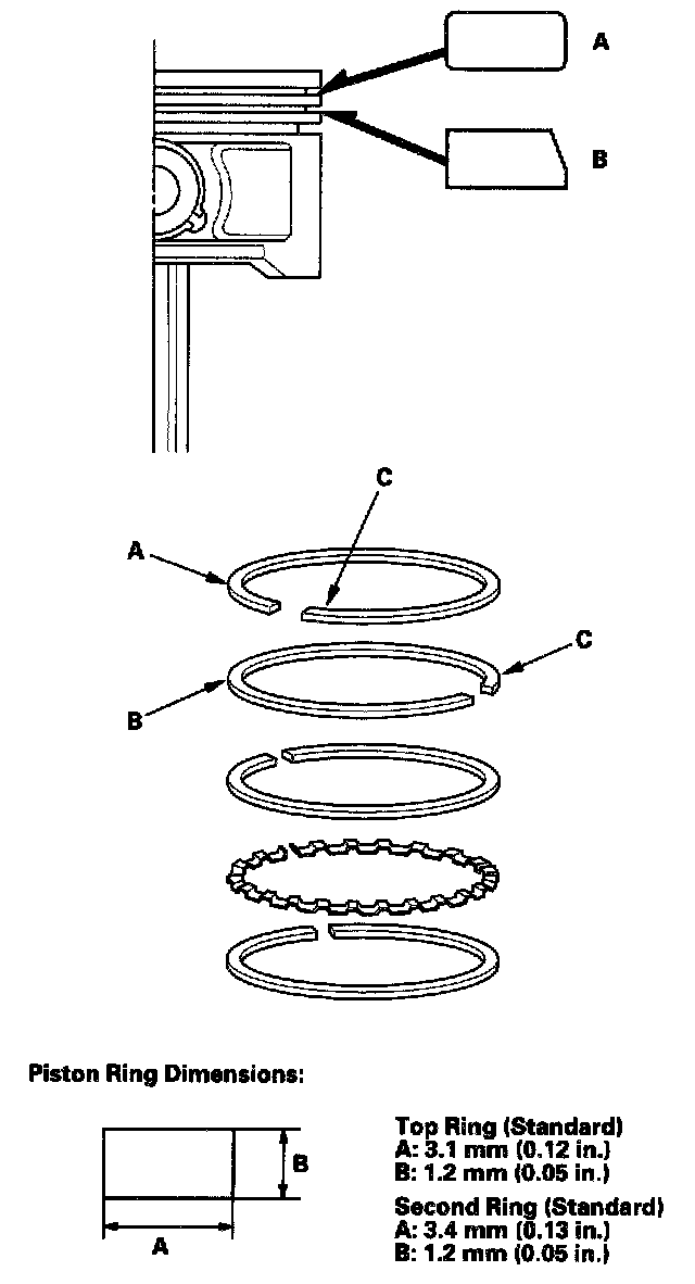 3. Clean all the ring grooves thoroughly with a squared-off broken ring or ring groove cleaner with a blade to fit the piston grooves. File down the blade if necessary. Top ring and second ring grooves are 1.2 mm (0.05 inch) wide, and the oil ring groove is 2.8 mm (0.11 inch) wide. Do not use a wire brush to clean the ring grooves, or cut the ring grooves deeper with the cleaning tool.