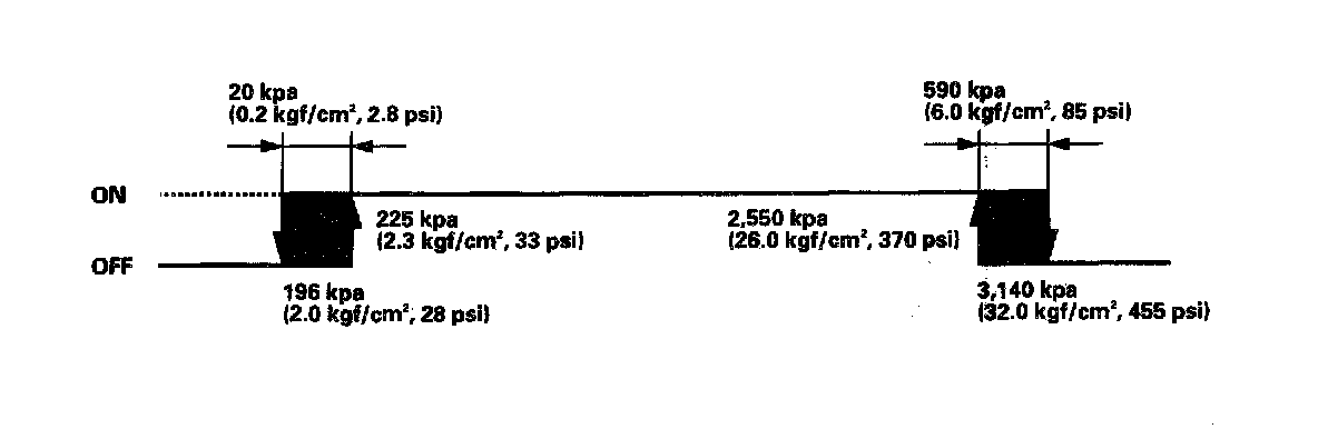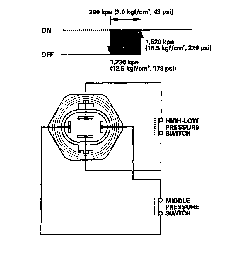 If the refrigerant pressure goes above or below 1,520 kpa (15.5 kgf/sq.cm, 220 psi), the A/C pressure switch sends a signal to the heater control panel or the climate control unit to change the speed of the condensor fan and radiator fan (High-Low).
