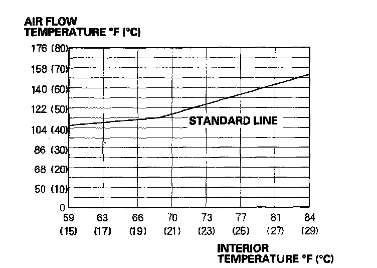 21. Set the temperature control dial on the front heating/cooling control panel to maximum, and select (Hot) mode on the rear control panel. Measure the temperature of the air from the rear floor vent for 2 or 3 minutes. Make sure the temperature is above the standard line of the graph shown. If the temperature is below the standard line, repeat steps 15 through 18 several more times. Then loosely install the radiator cap and recheck.