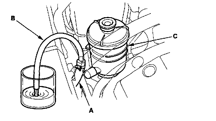 3. Start the engine, let it run at idle, and turn the steering wheel from lock-to-lock several times. When fluid stops running out of the hose, shut off the engine. Discard the fluid.