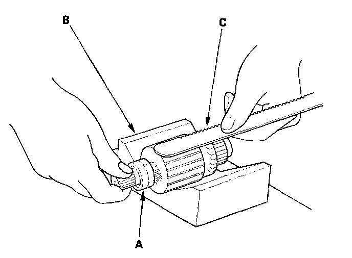 9. Place the armature (A) on an armature tester (B). Hold a hacksaw blade (C) on the armature core. If the blade is attracted to the core or vibrates while the core is turned, the armature is shorted. Replace the armature.