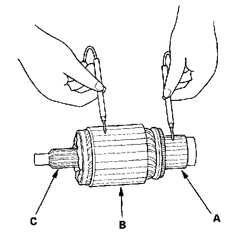 10. Check with an ohmmeter that no continuity exists between the commutator (A) and armature coil core (B), and between the commutator and armature shaft (C) If continuity exists, replace the armature.