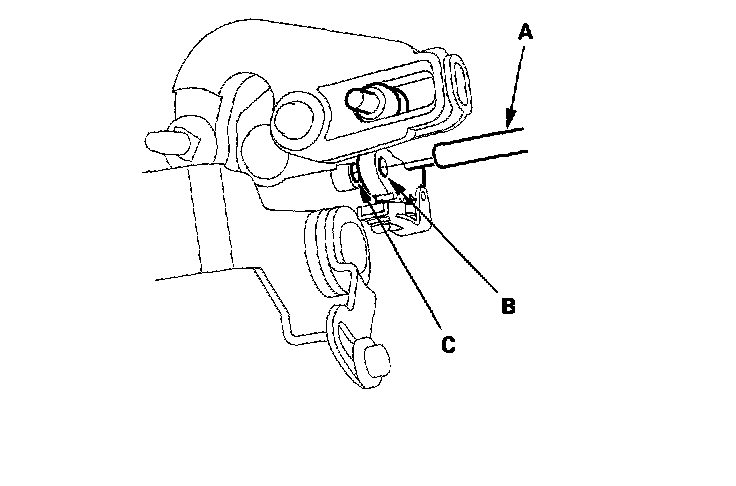 18. Insert a 6.0 mm (0.24 inch) pin (A) through the positioning hole (B) on the detent plate and into the positioning hole (C) on the control bracket.