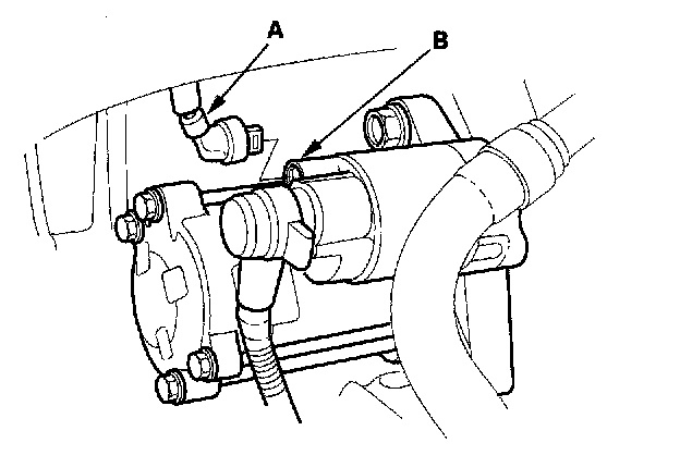 5. Make sure the transmission is in neutral, then disconnect the BLK/WHT wire (A) from the starter solenoid (B). Connect a jumper wire from the battery positive terminal to the solenoid terminal.