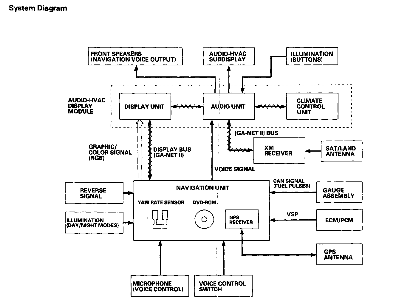 The GA-NET bus provides communication between the navigation unit and the display unit. This bus also links the components in the audio-HVAC display module. The bus is used to pass button and touch-screen commands to the navigation unit. In addition, muting and voice control commands are sent to the display unit and the audio and climate control systems for processing. The audio unit uses the bus to control the XM-receiver or other accessories.