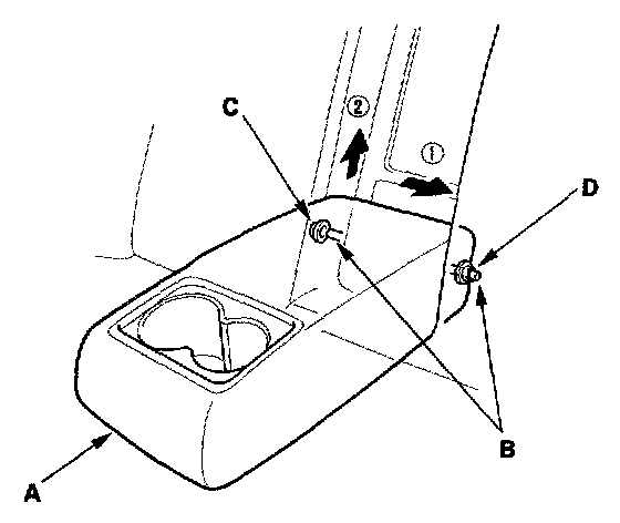 -2 Remove the pivot shaft (B) from the collar (C) on the passenger's side of the vehicle by pulling up on the armrest, and remove the pivot shaft (B) from the collar (D) by pulling up on the armrest.