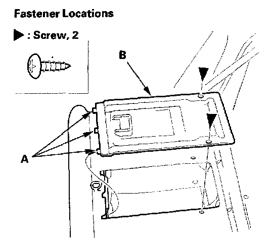 5. Remove the screws, and detach the hooks (A), then remove the trunk pass-through cover (B).