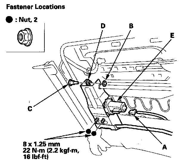 4. Remove the push nut (B) and the pin (C) from the link (D), then remove the nuts securing the up-down motor (E).