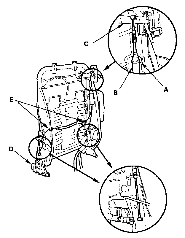 4. Detach the cable clip (A), and disconnect the rear seat access cable (B) from the rear seat access lever (C) and both recline adjusters (D). Release the wire ties (E), then remove the cable.