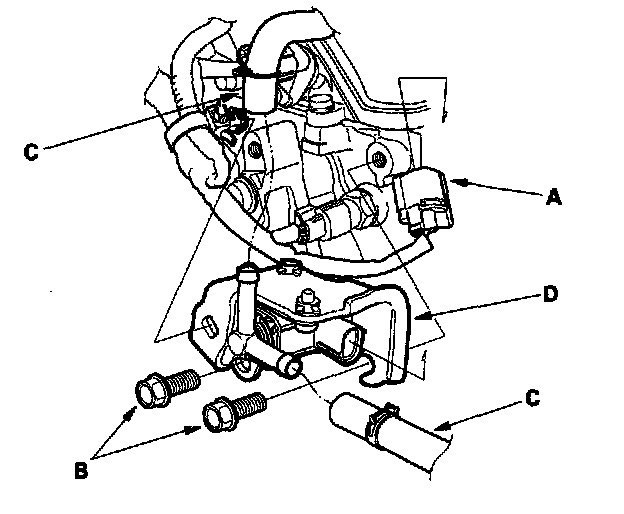 2. Remove the bolts (B) and the hoses (C), then remove the EVAP canister purge valve assembly (D).