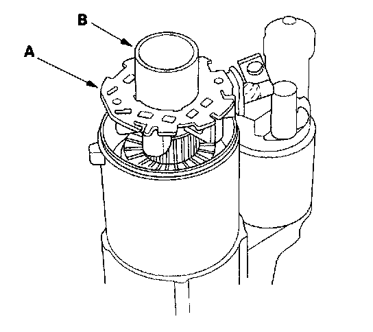 17. Install the brush into the brush holder, and set the armature (A) in the brush holder (B).