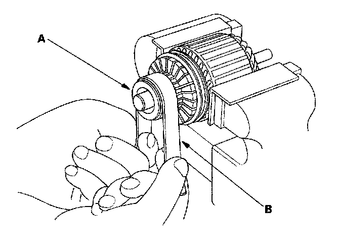 9. Place the armature (A) on an armature tester (B). Hold a hacksaw blade (C) on the armature core. If the blade is attracted to the core or vibrates while the core is turned, the armature is shorted. Replace the armature.