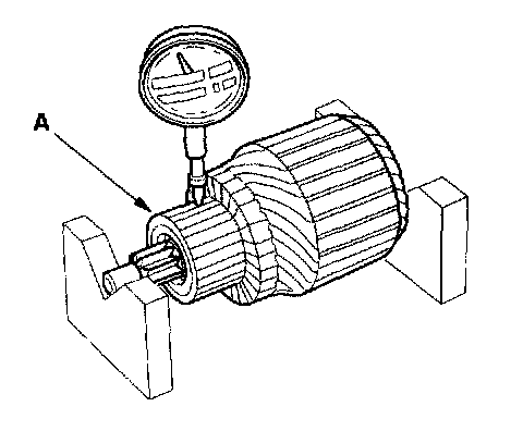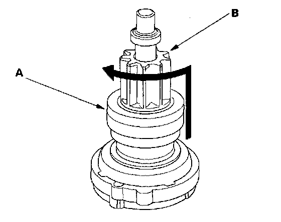 18. Rotate the overrunning clutch (A) both ways. Does it lock in one direction and rotate smoothly in reverse? If it does not lock in either direction or it locks in both directions, replace it.