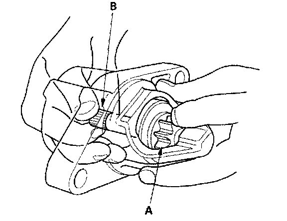 14. While holding the drive gear (A), turn the gear shaft (B) clockwise. Check that the drive gear comes out to the other end. If the drive gear does not move smoothly, replace the gear cover assembly.