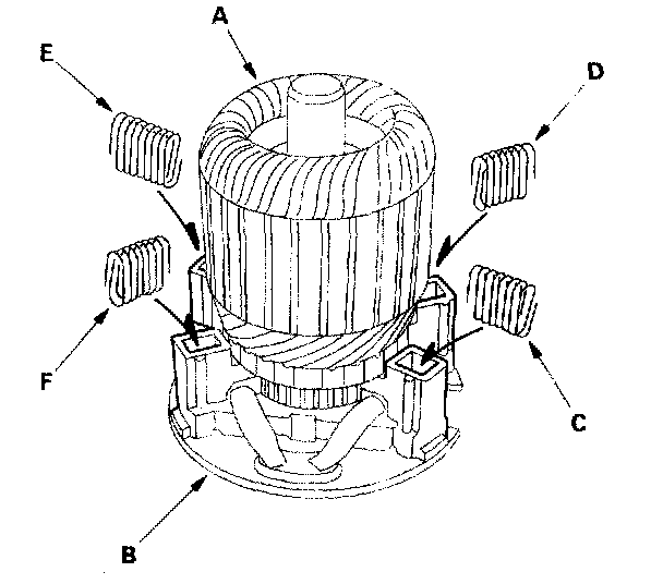 13. Check with an ohmmeter that no continuity exists between the commutator (A) and armature coil core (B), and between the commutator and armature shaft (C). If continuity exists, replace the armature.