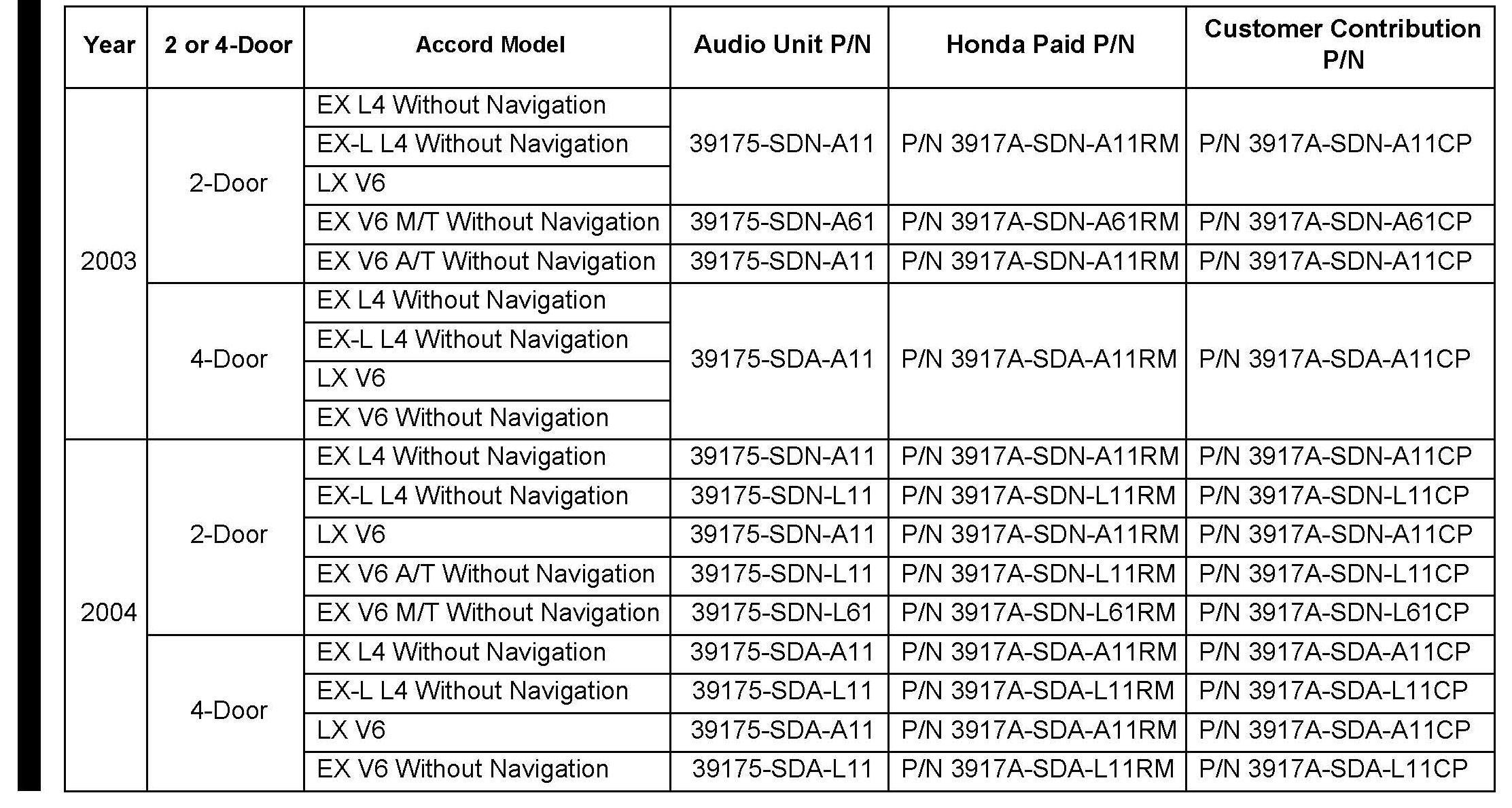 *The matrix lists audio unit information as installed at the factory. There is a chance that the audio unit has been changed from the original. To ensure that the correct PCB is used, always match the audio unit part number (label found on the audio unit chassis) with the PCB part number. The part number for an audio unit starts with 39175and the PCB part number starts with 3917A." Match the next six characters of the audio unit part number with the next six of the PCB part number.