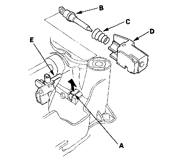 4. Install the new shift lock solenoid by aligning the joint of the shift lock solenoid plunger with the tip of the shift lock stop (E).