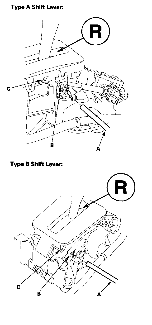 9. Insert a 6.0 mm (0.24 inch) pin (A) through the positioning hole (B) on the shift lever bracket base and into the positioning hole (C) on the shift lever. The shift lever is secured in the R position.