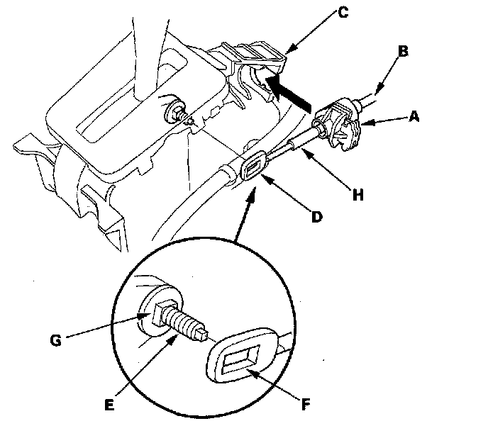 10. Align the socket holder (A) on the shift cable (B) with the slot in the bracket base (C), then slide the holder into base. Install the shift cable end (D) over the mounting stud (E) by aligning its square hole (F) with the square fitting (G) at the bottom of the stud. Push the holder until it snaps securely in place. Do not install the shift cable by holding the shift cable guide (H).