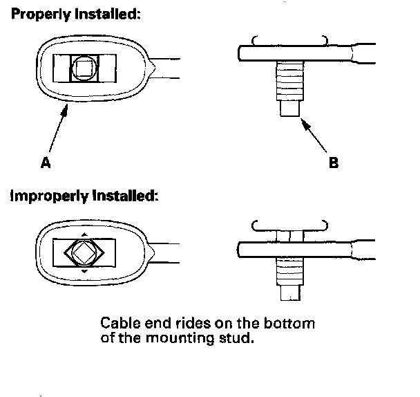 11. Verify that the shift cable end (A) is properly installed on the mounting stud (B).
