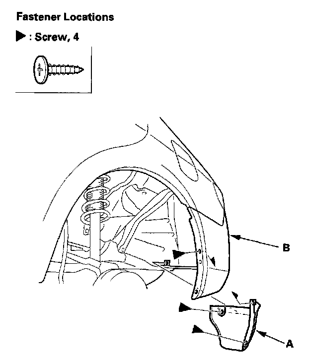 1. Remove the screws, then remove rear inner fender (A) from the rear bumper (B) and body.