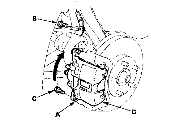 4. Remove the flange bolt (C) while holding the pin A with a wrench being careful not to damage the pin boot, and pivot the caliper (D) up out of the way. Check the brake hoee and pin boots for damage and deterioration.