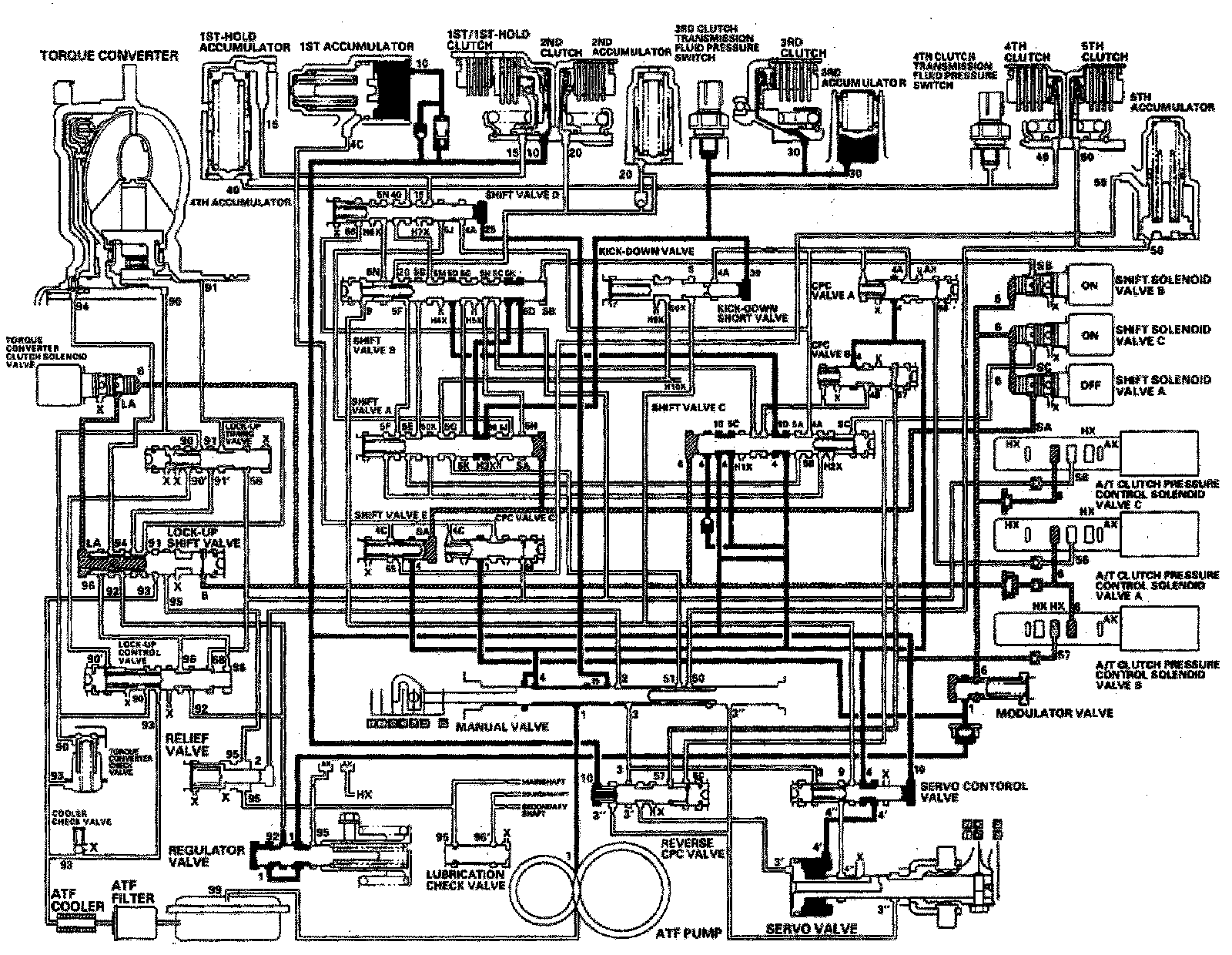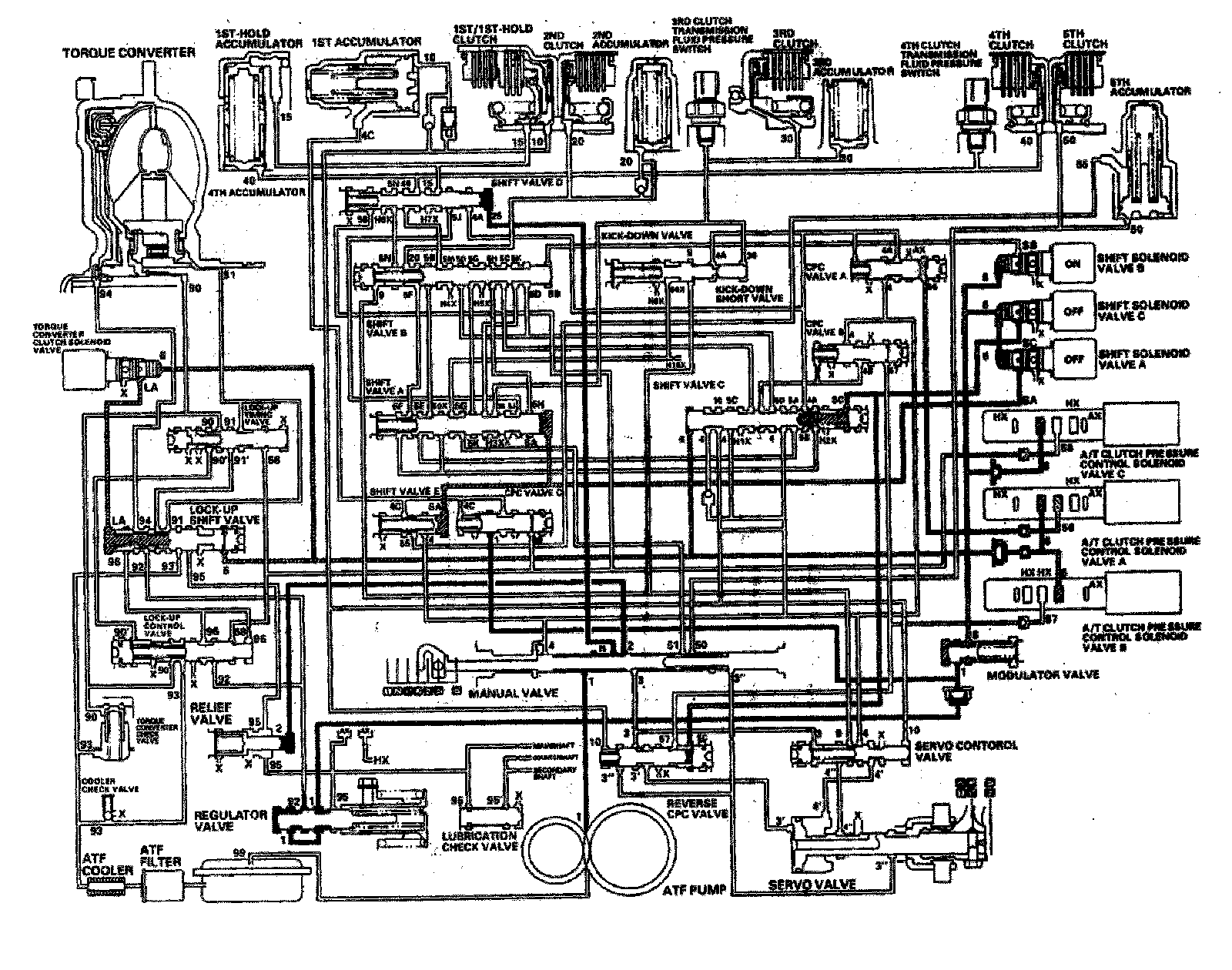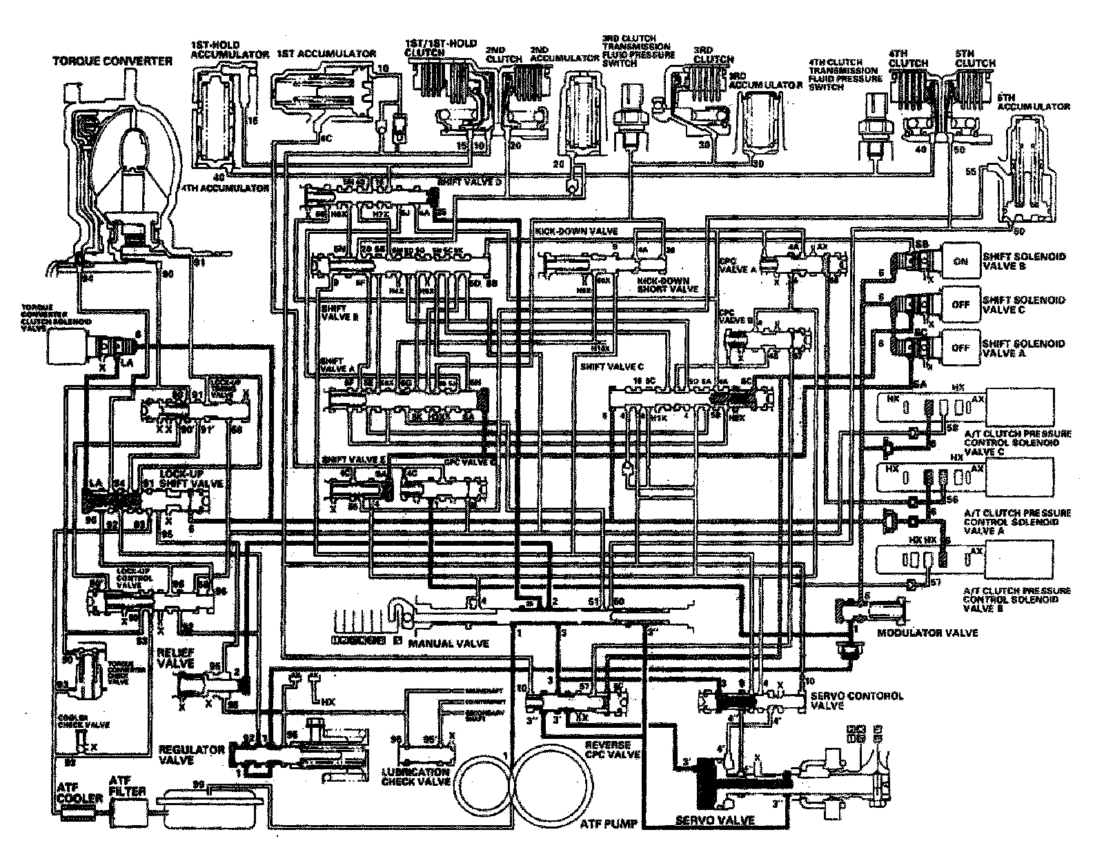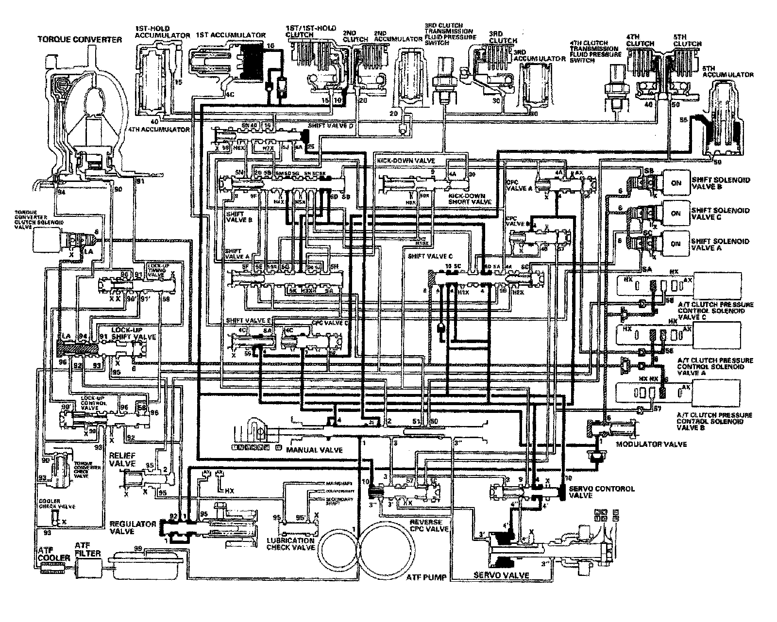 The PCM controls the shift solenoid valves ON and OFF, and the shift solenoid valves control shift solenoid pressure to the shift valves. Applying shift solenoid pressure to the shift valves moves the position of the shift valve, and switches the port of hydraulic pressure. The PCM also controls A/T clutch pressure control solenoid valves A and B.