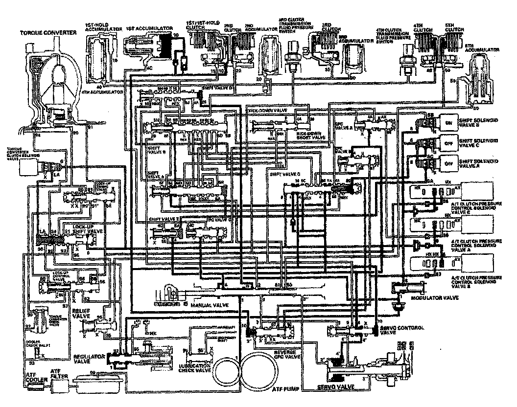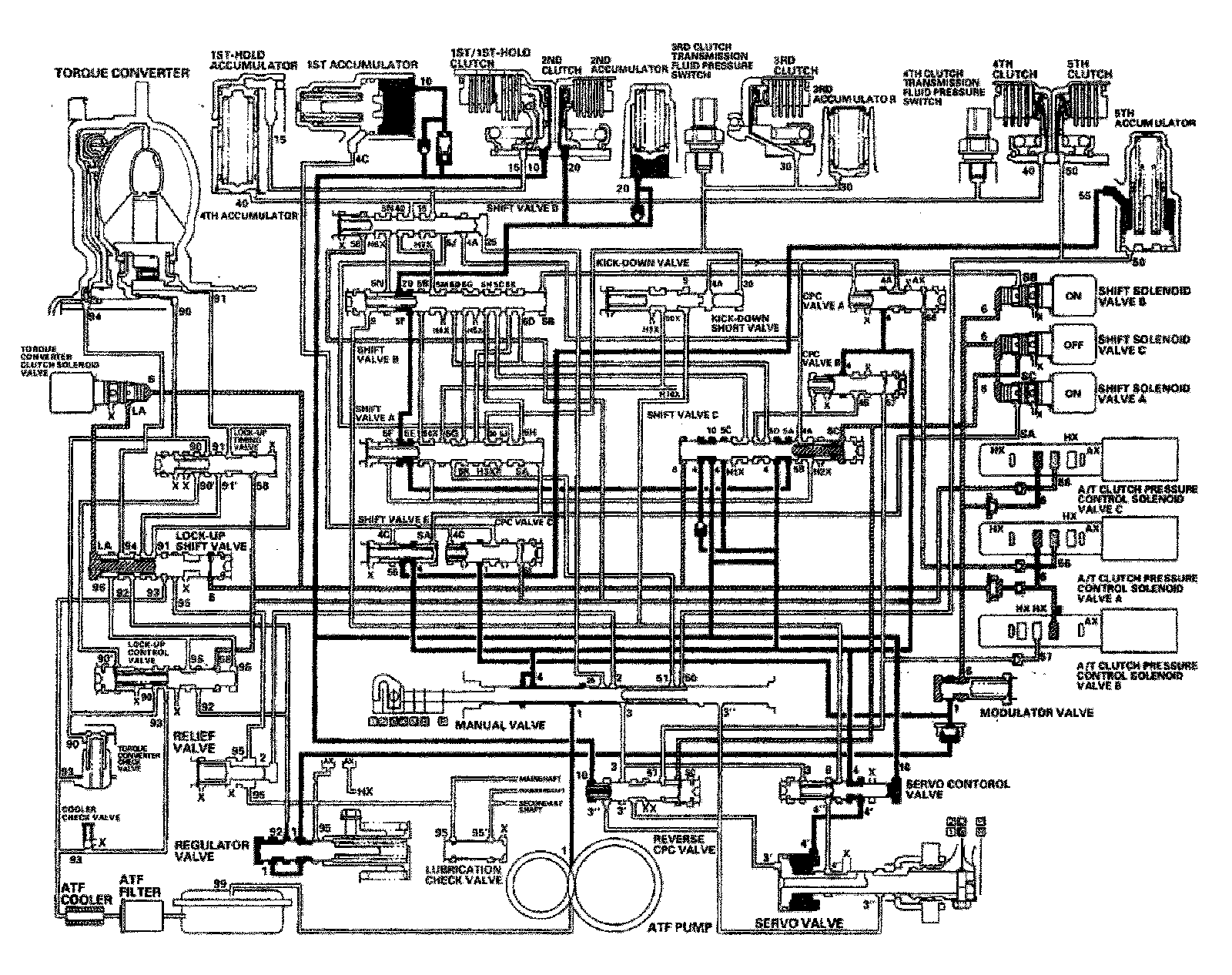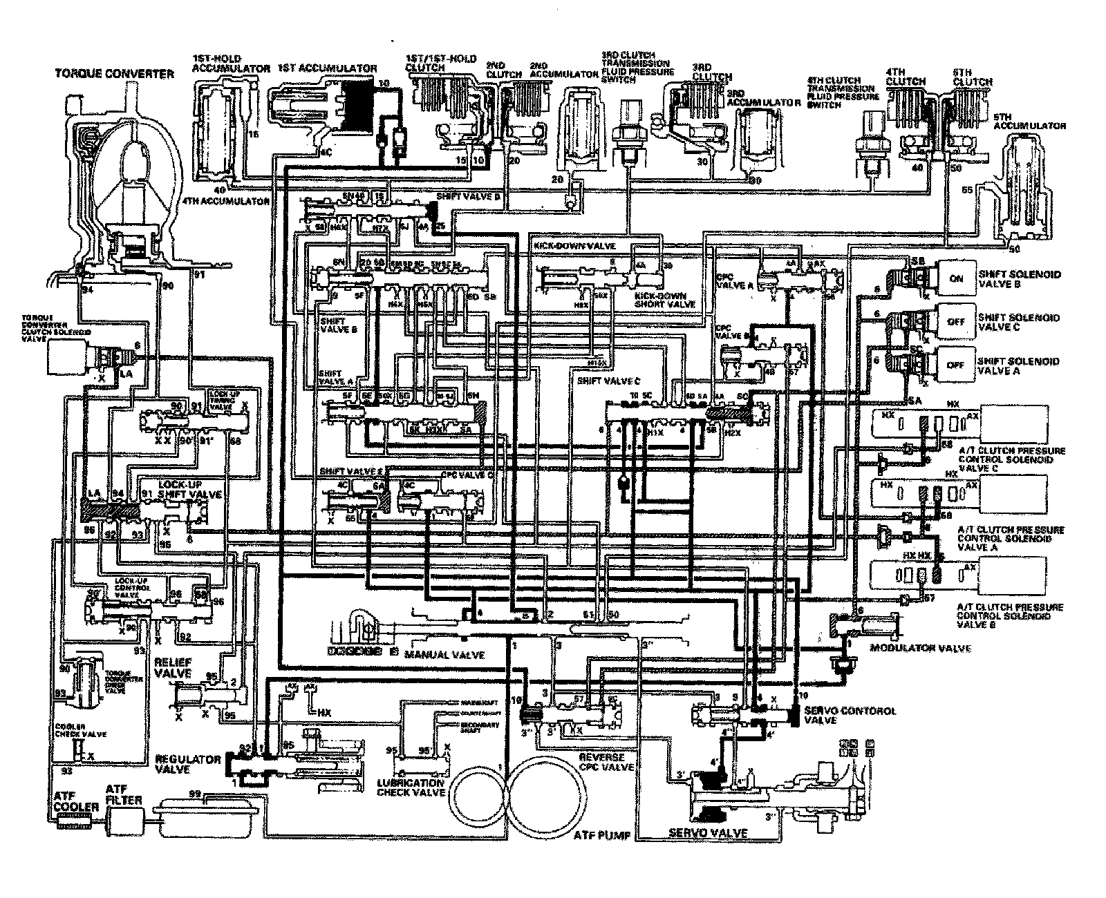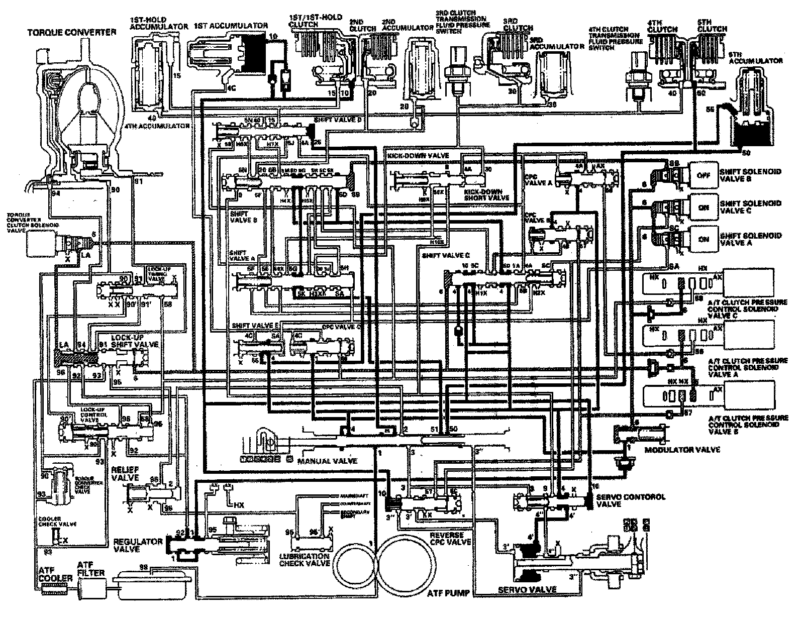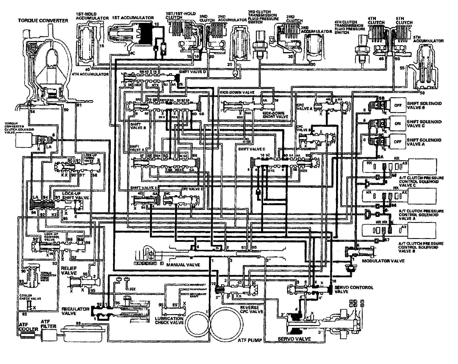 The PCM controls the shift solenoid valves ON and OFF, and the shift solenoid valves control shift solenoid pressure to the shift valves. Applying shift solenoid pressure to the shift valves moves the position of the shift valve, and switches the port of hydraulic pressure. The PCM also controls A/T clutch pressure control solenoid valves A and B.