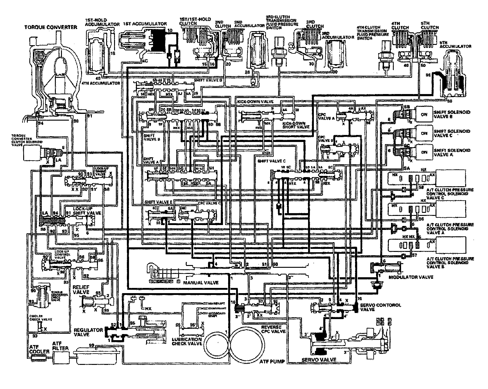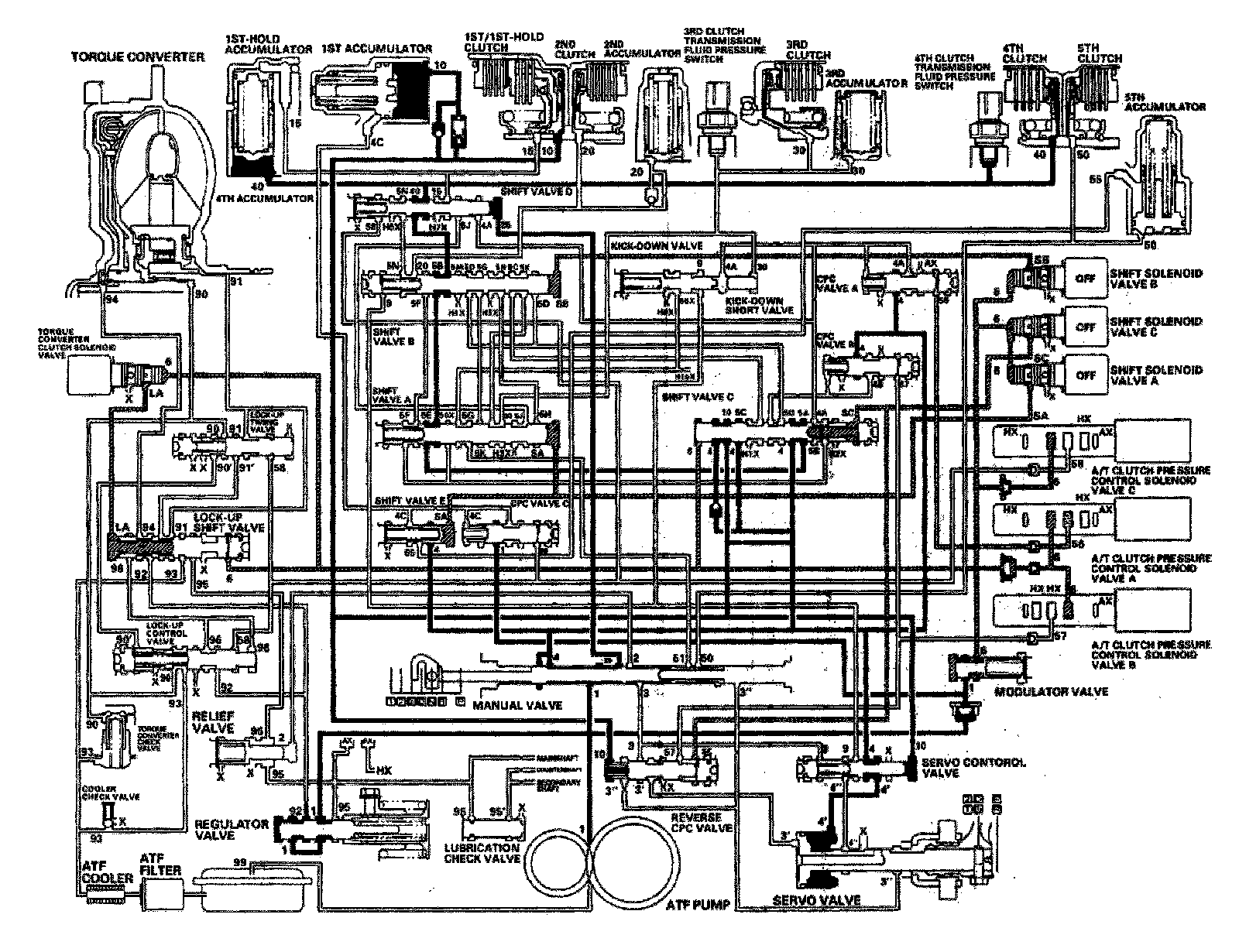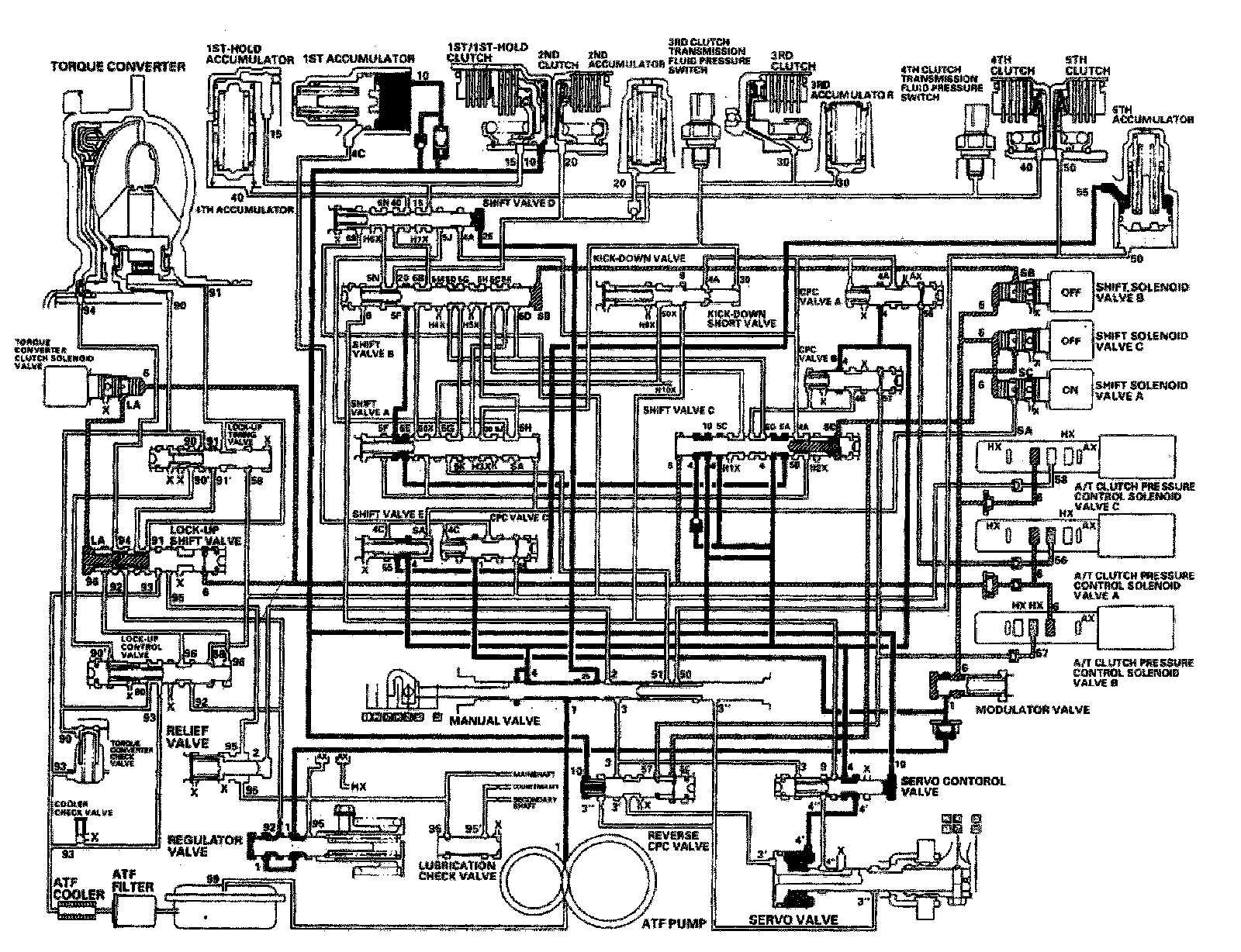 When the R position is selected while the vehicle is moving forward at speeds over 6 mph (10 km/h), the PCM outputs to turn shift solenoid valves A and C ON; and shift solenoid valve B remains ON. The reverse CPC valve is moved to right side and covers the port to stop the line pressure (3') to the servo valve. The line pressure (3') is not applied to the servo valve, and the 5th clutch pressure (50) is not applied to the 5th clutch. As a result, power is not transmitted to the reverse position.