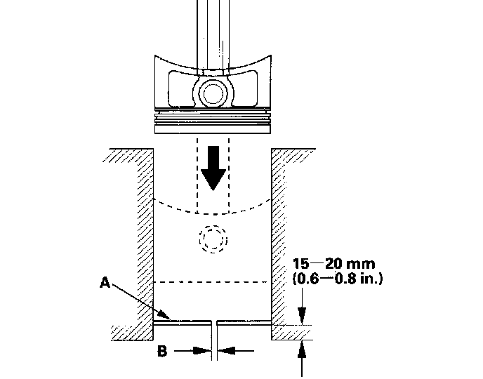 4. Using a piston, push a new ring (A) into the cylinder bore 15 - 20 mm (0.6 - 0.8 inch) from the bottom.