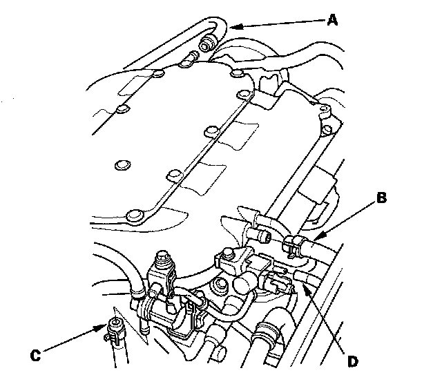 3. Remove the positive crankcase ventilation (PCV) hose (A), brake booster vacuum hose (B), evaporative emission (EVAP) canister hose (C), and vacuum hose (D).